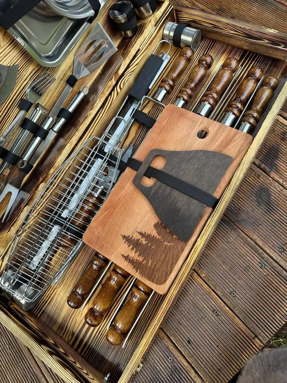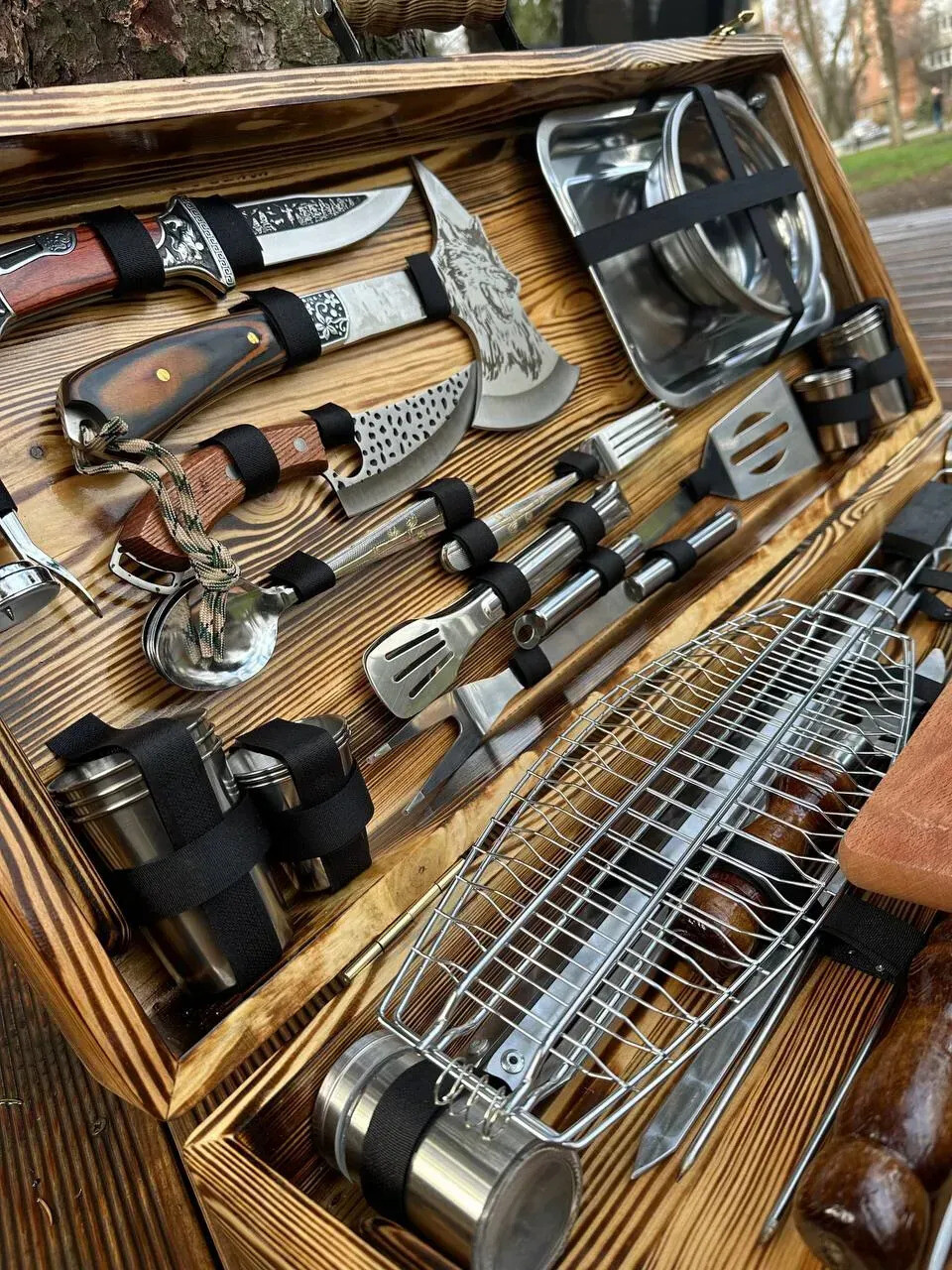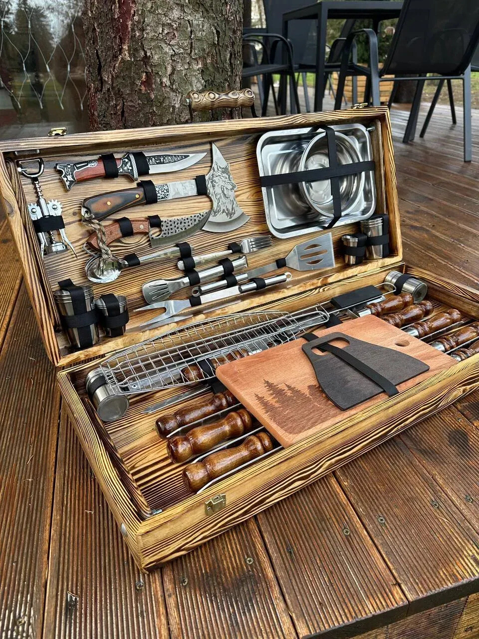 Acesta este un set de top, dedicat celor care vor control total, versatilitate și impact vizual la fiecare ieșire la grătar. Include ustensile profesionale pentru carne, legume, pește, servire și foc – totul într-o configurație impresionantă, ideală pentru grătar, camping, cabană sau activități outdoor.