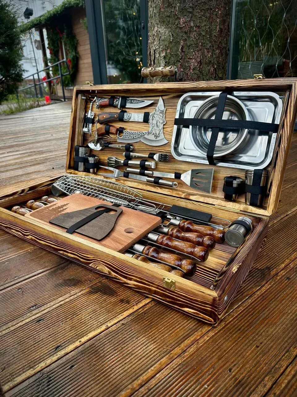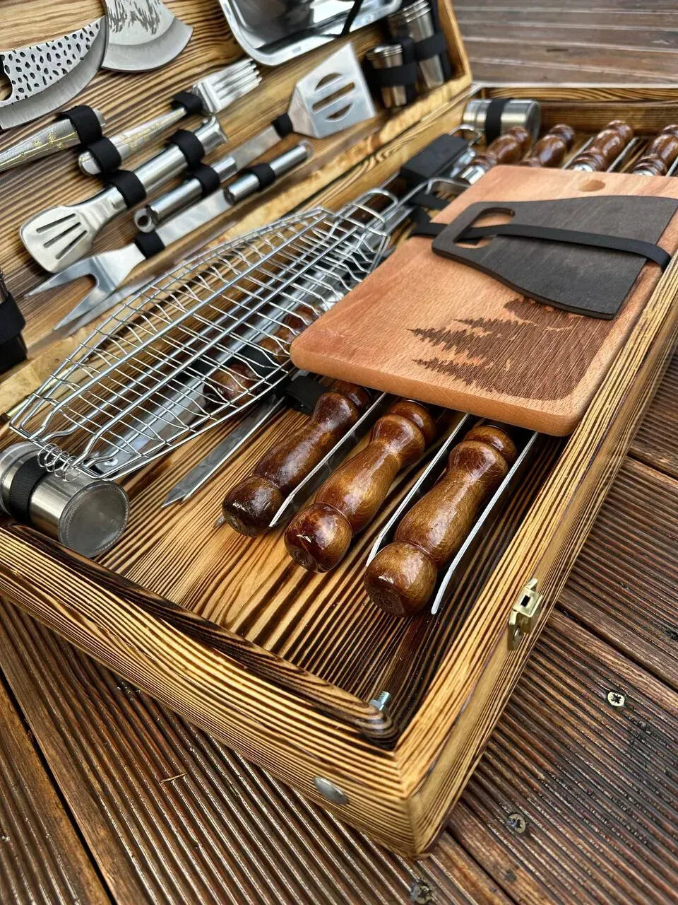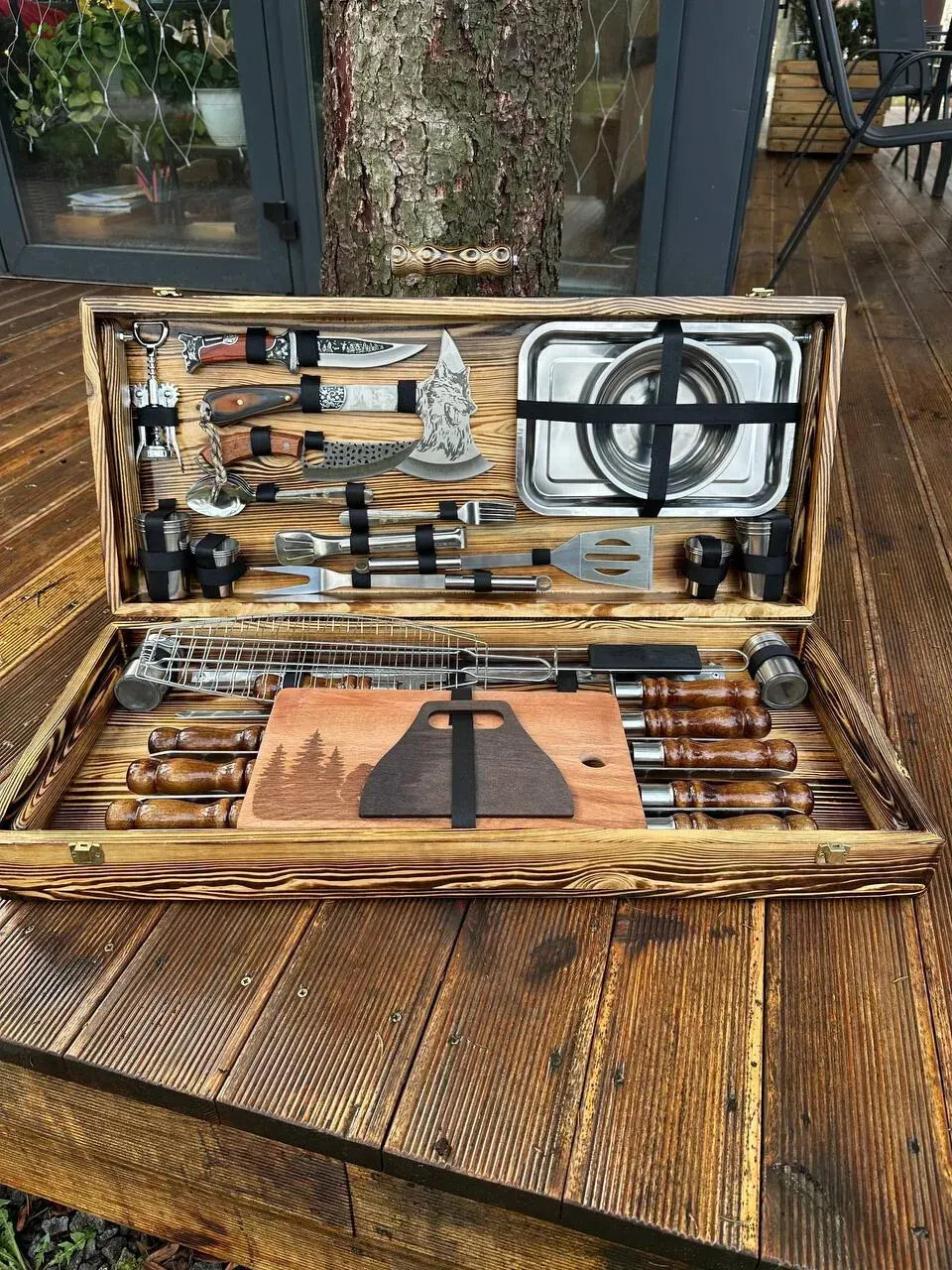 Acesta este un set de top, dedicat celor care vor control total, versatilitate și impact vizual la fiecare ieșire la grătar. Include ustensile profesionale pentru carne, legume, pește, servire și foc – totul într-o configurație impresionantă, ideală pentru grătar, camping, cabană sau activități outdoor.