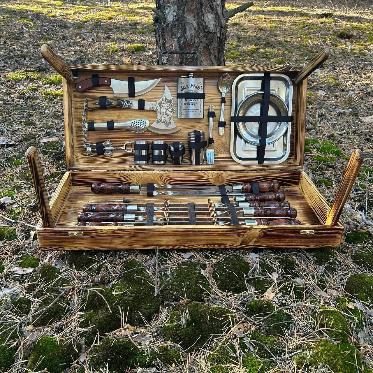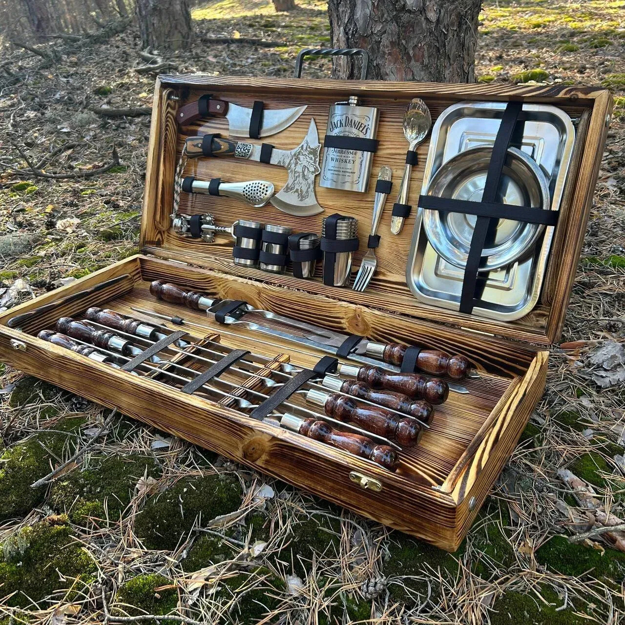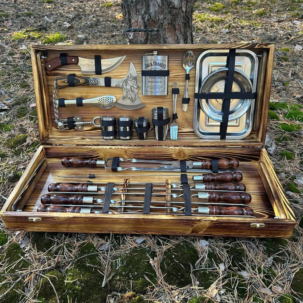 ✅ Set complet pentru 6 persoane✅ Frigărui groase din oțel inoxidabil (3 mm) – rezistente și durabile✅ Include frigărui duble pentru carne și legume✅ Accesorii complete pentru gătit, servire și băuturi✅ Topor gravat WOLF – element premium și spectaculos✅ Ideal pentru grătar, picnic, camping, cabană
