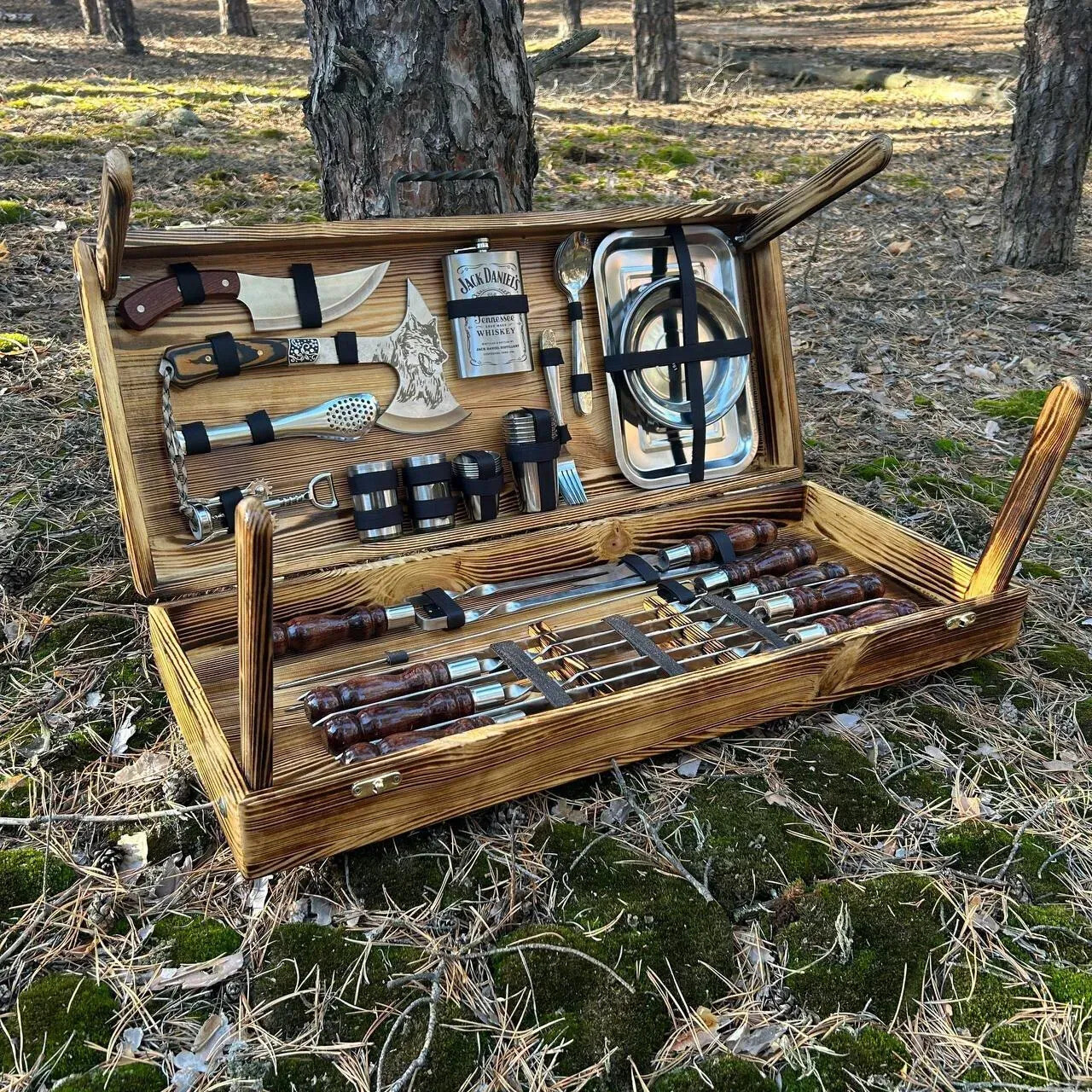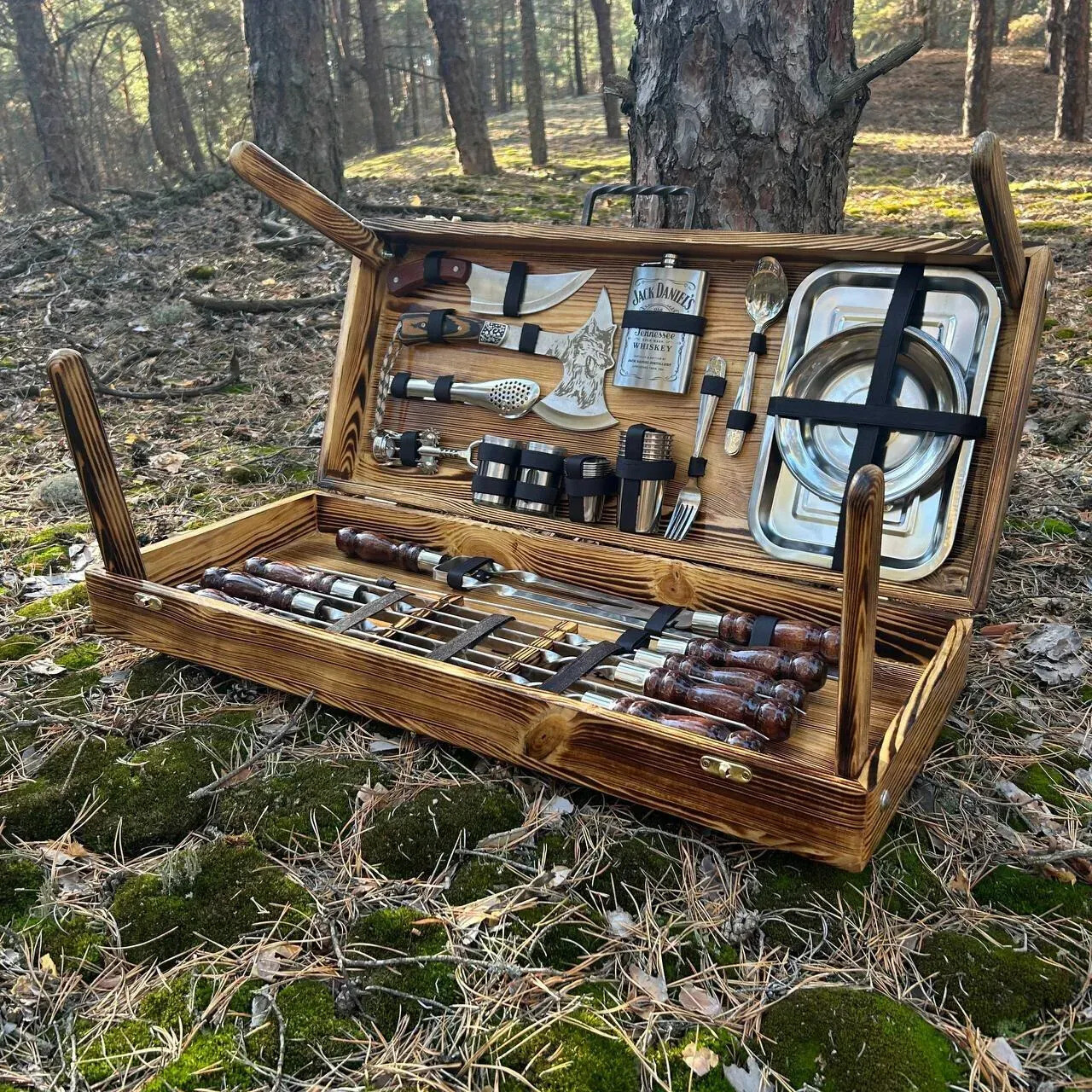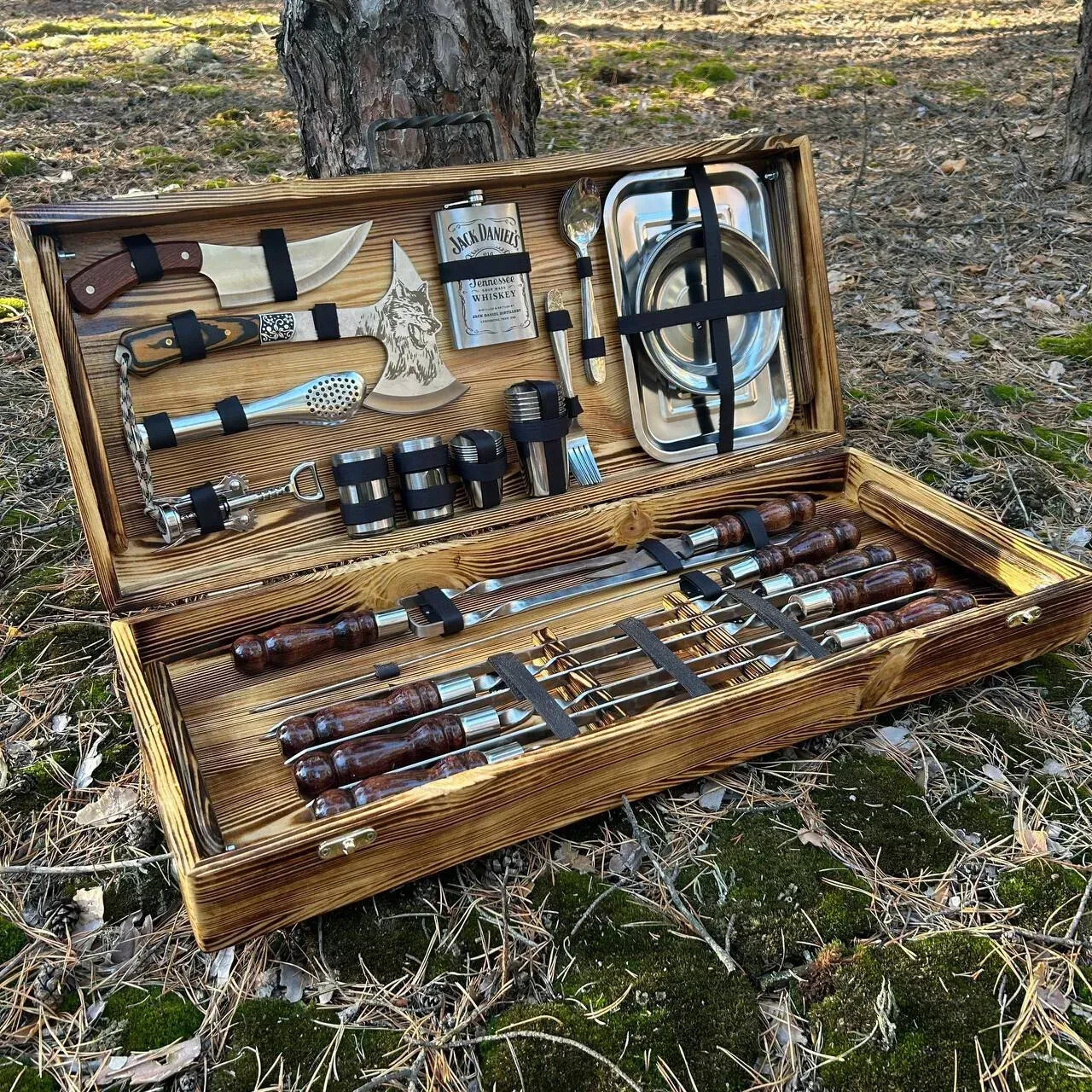 ✅ Set complet pentru 6 persoane✅ Frigărui groase din oțel inoxidabil (3 mm) – rezistente și durabile✅ Include frigărui duble pentru carne și legume✅ Accesorii complete pentru gătit, servire și băuturi✅ Topor gravat WOLF – element premium și spectaculos✅ Ideal pentru grătar, picnic, camping, cabană