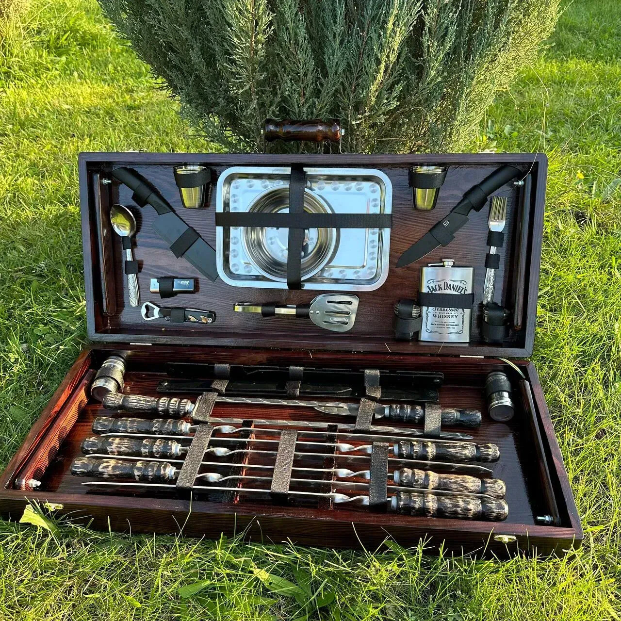 Acest set complet și foarte bine echipat este ideal pentru grătare în aer liber, camping sau picnicuri, oferind tot ce ai nevoie: gătit, servire, băuturi și aprinderea focului. Un pachet practic, robust și ușor de folosit.