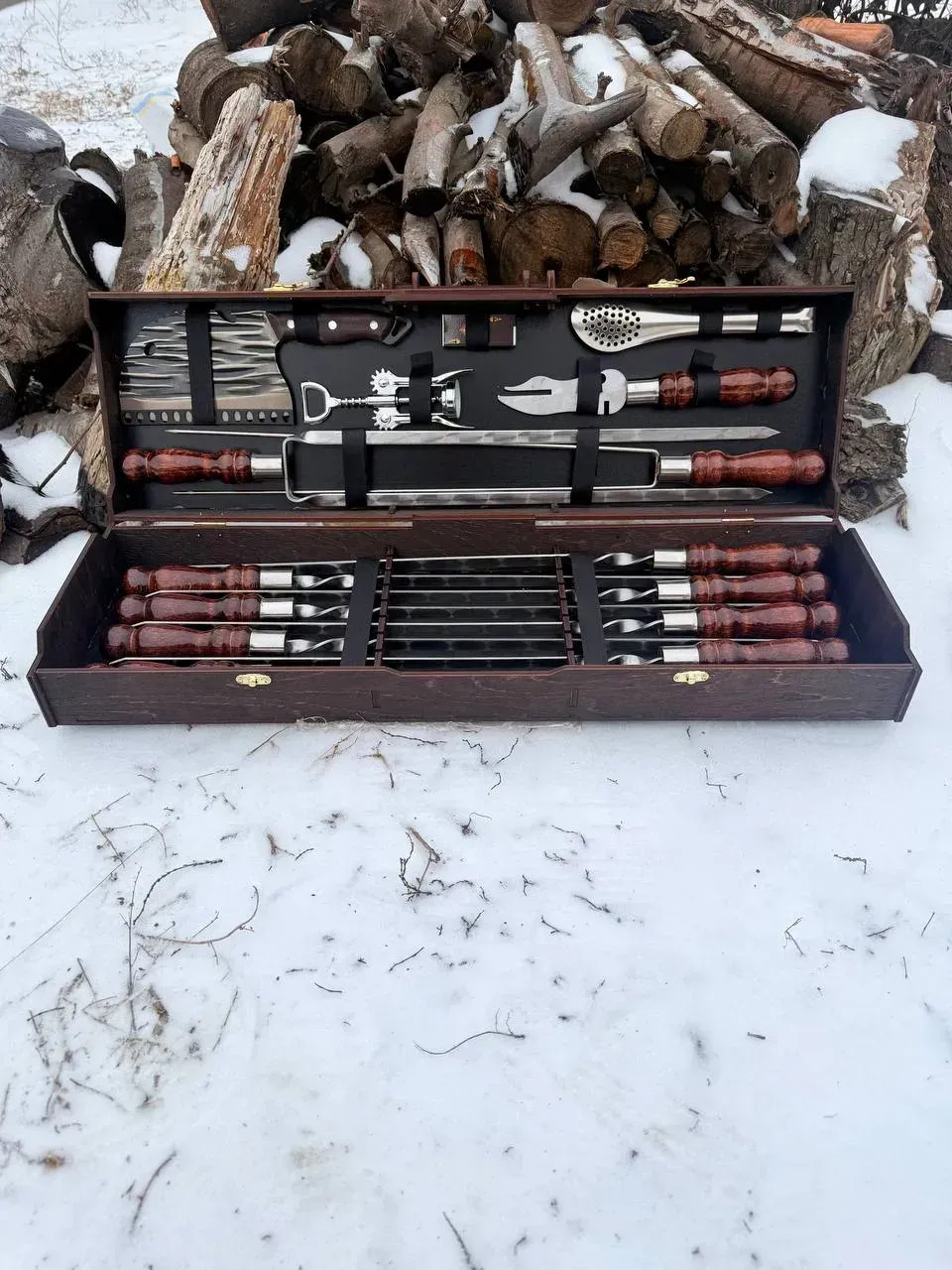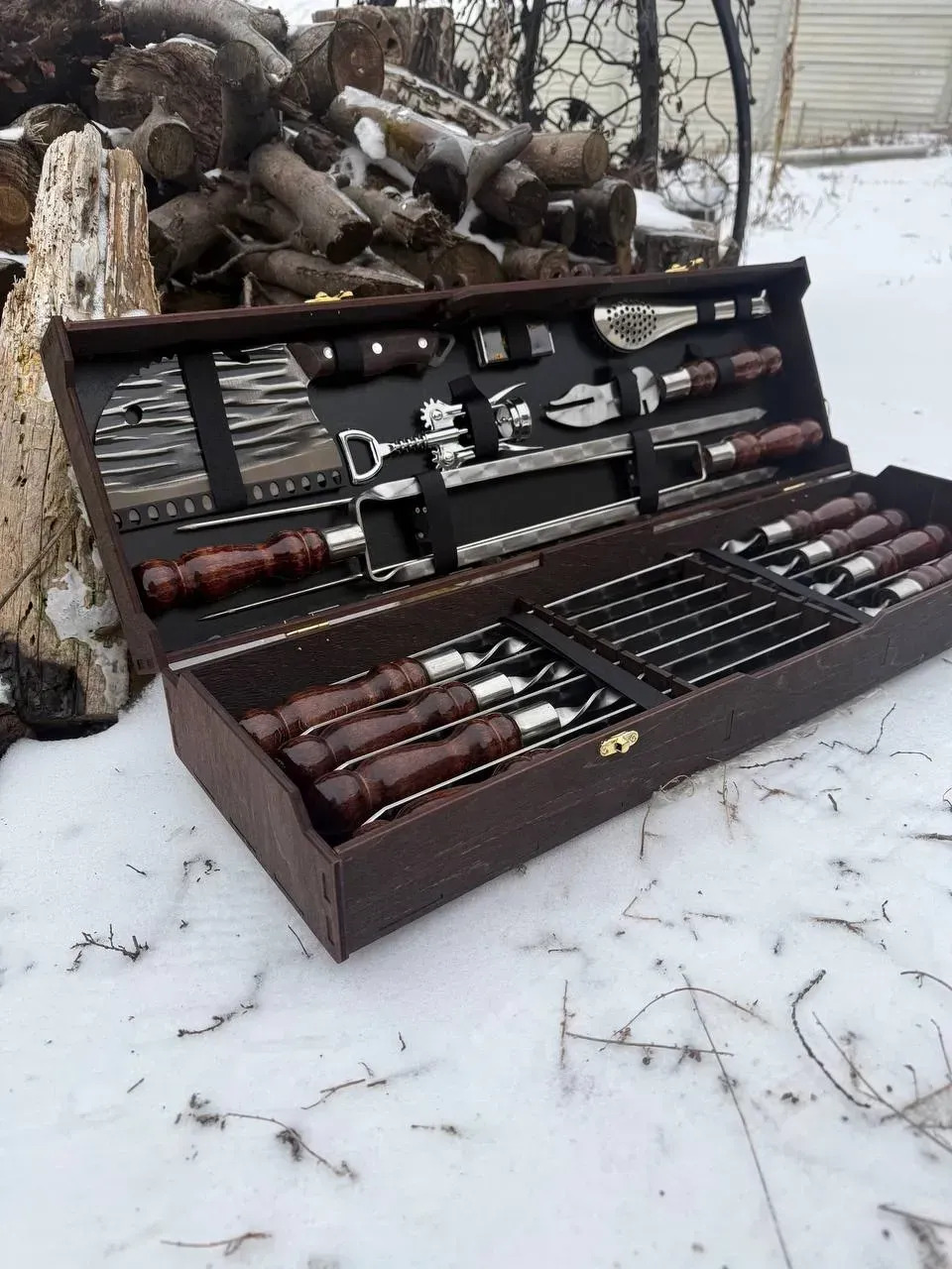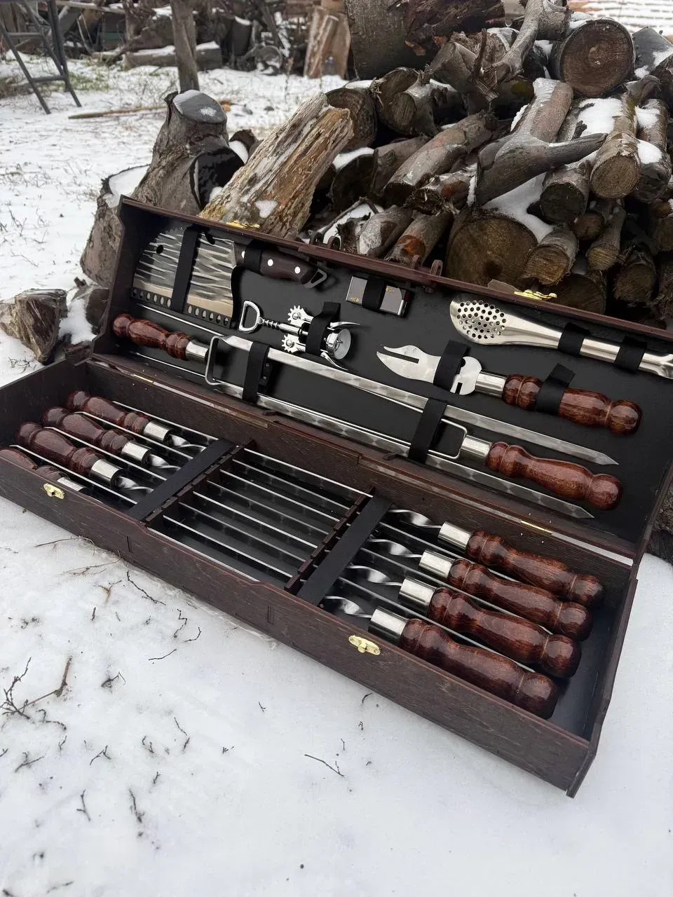 Set complet pentru gratar, ideal pentru pasionatii de gatit in aer liber. Include frigarui profesionale, ustensile solide si accesorii utile, realizate din materiale de calitate si finisate manual.
